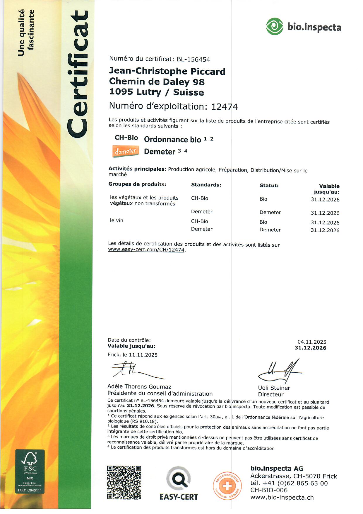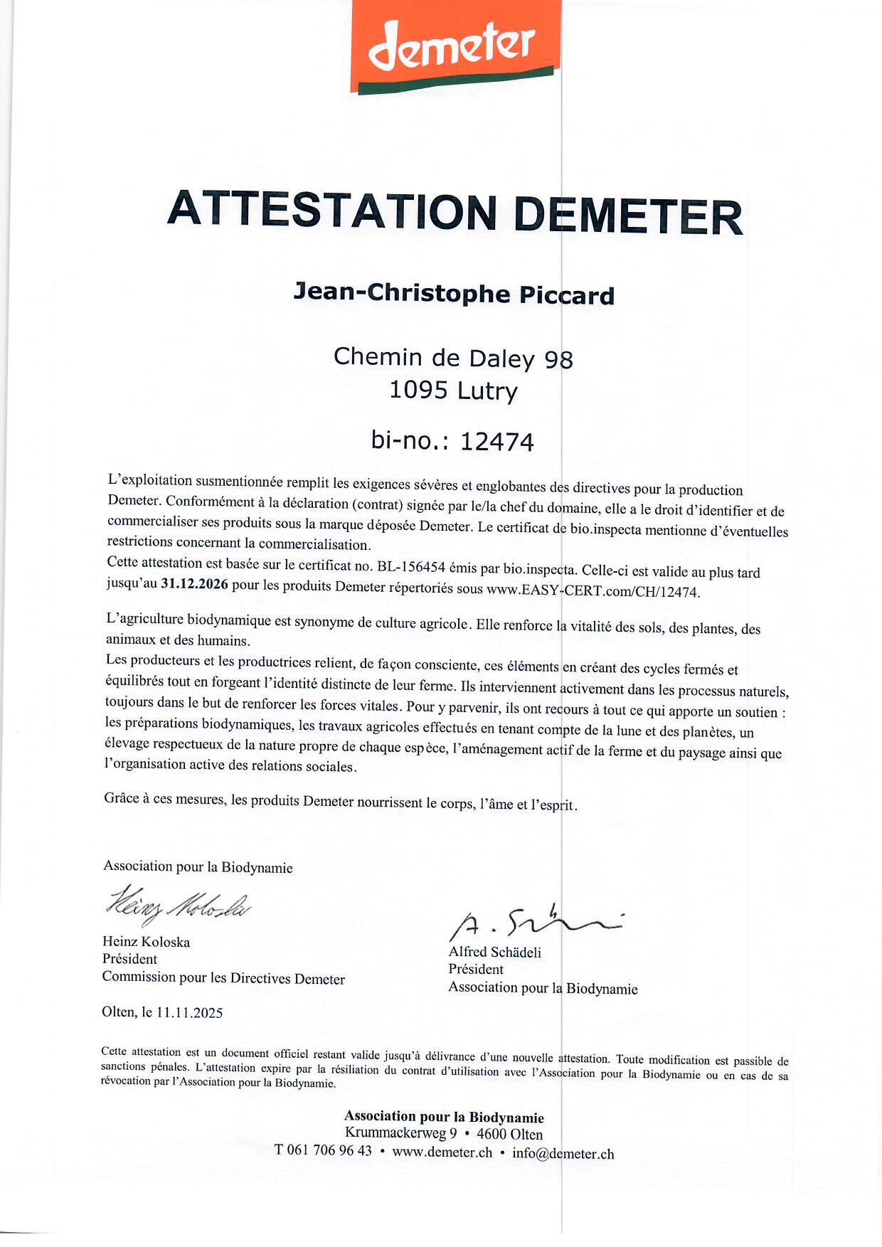 La vigne cultivée en biodynamie selon les préceptes de Rudolph Steiner garantit qu'aucune sorte d'engrais (à part du compost biodynamique ou du fumier), d'insecticide ou d'herbicide n'est utilisée.